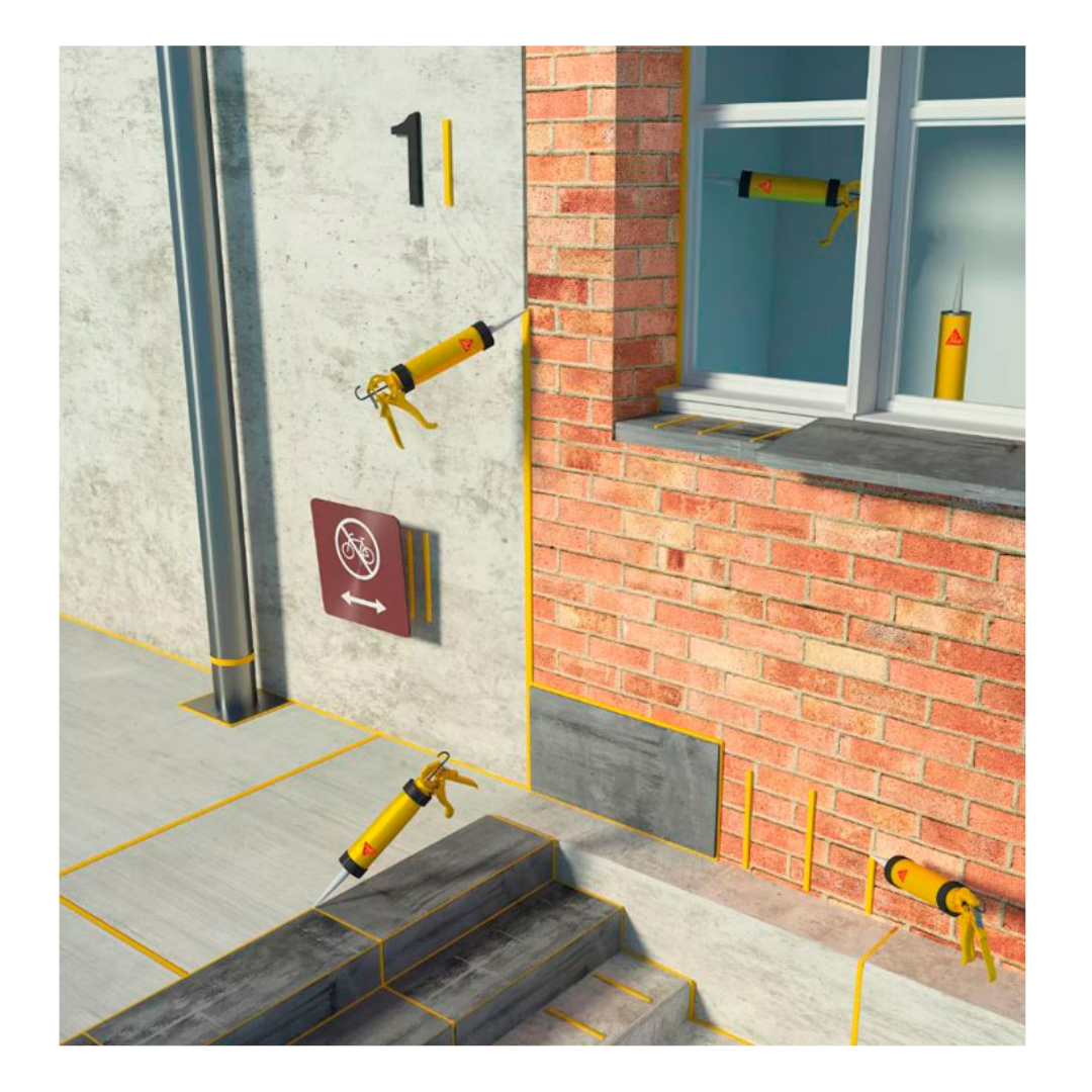 - Juntas de conexión para inserciones en suelos y paredes, como canalones o penetraciones, así como entre diferentes elementos constructivos, por ejemplo, entre paredes de hormigón y ladrillo, alrededor de ventanas y entre pisos, paredes y techos.