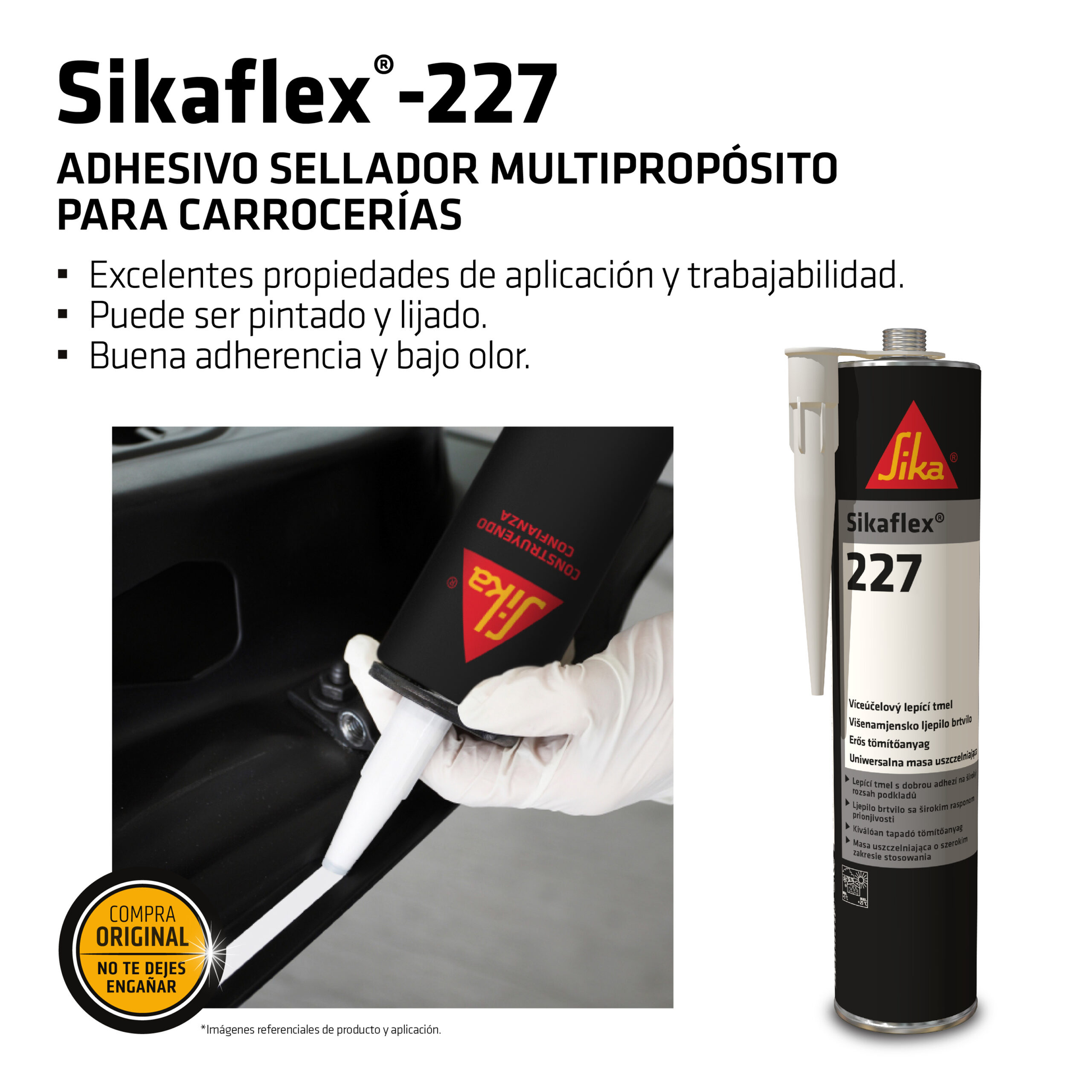 Sikaflex®-227 es un sellador de poliuretano de un componente diseñado para sellar carrocerías , el cual cura por exposición a la humedad atmosférica para formar un elastómero duradero. Sikaflex®-227 está fabricado de acuerdo con las normas ISO 9001 / 14001 del sistema de aseguramiento de calidad y con el programa “Responsible Care”.